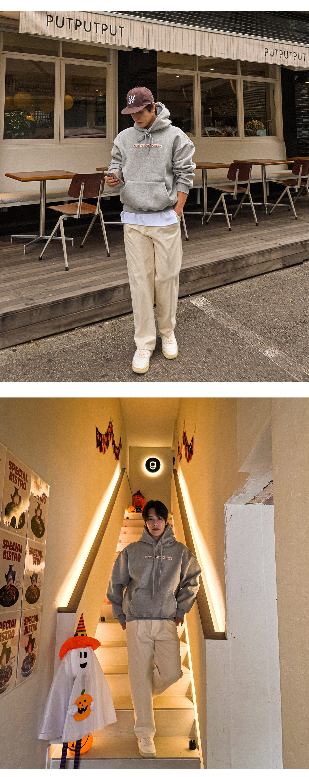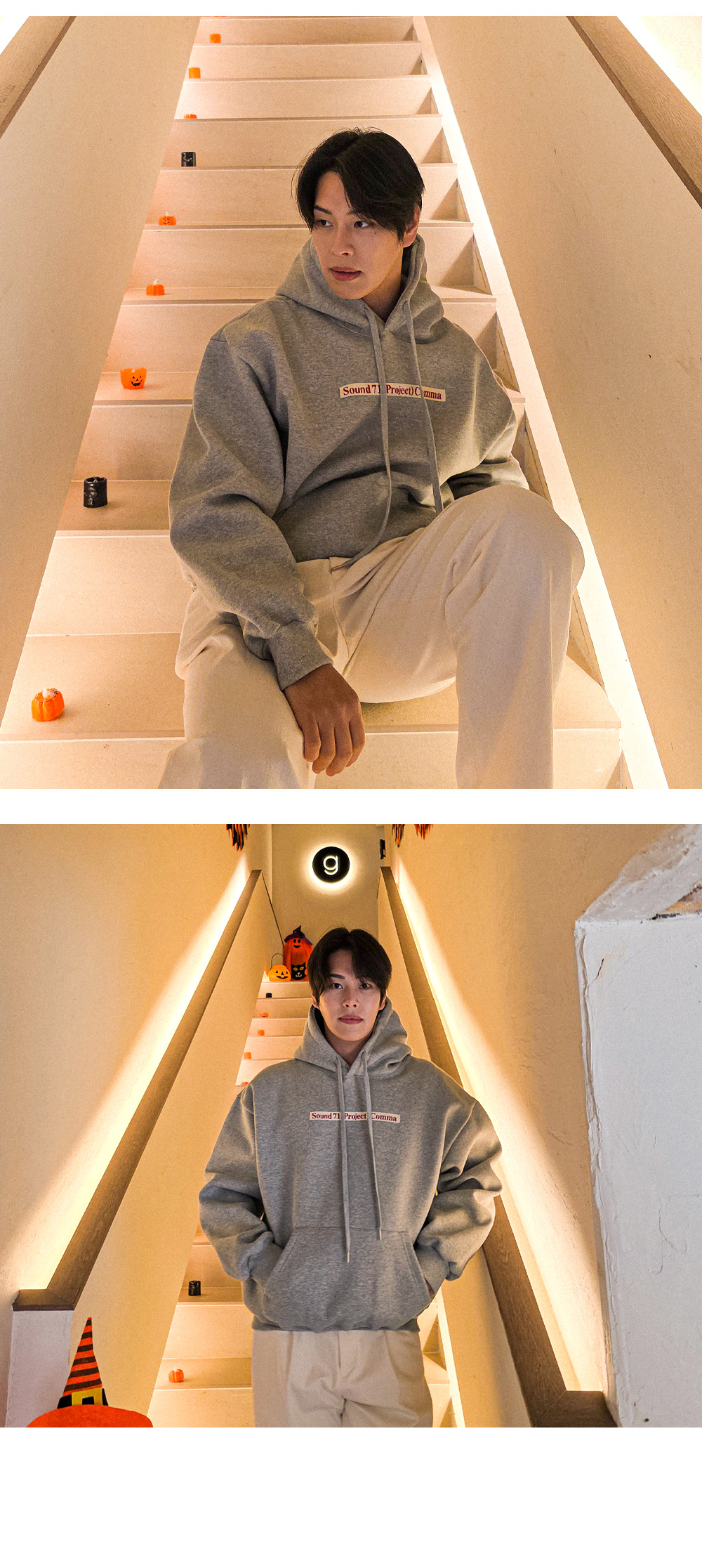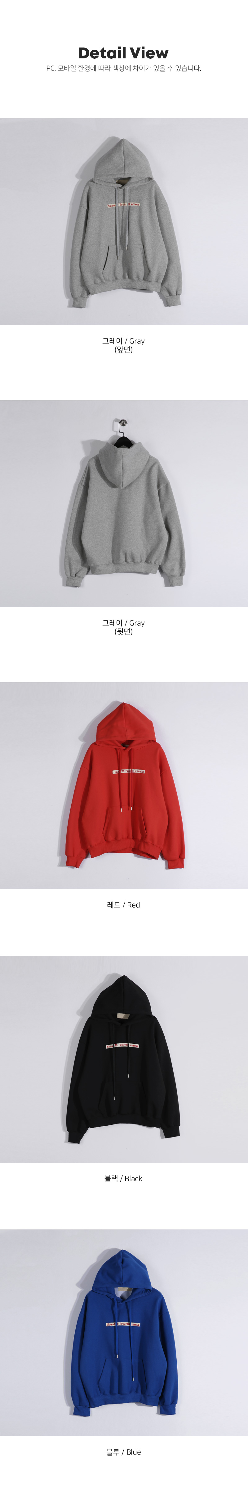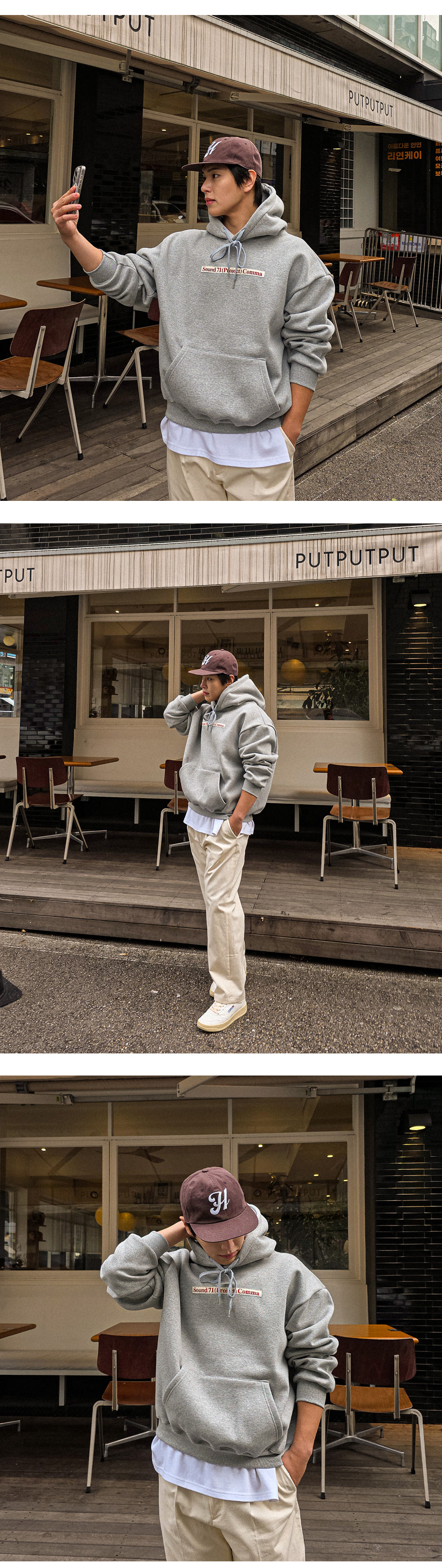 레터링 패치로 포인트를 준 기모 후드 티셔츠입니다.