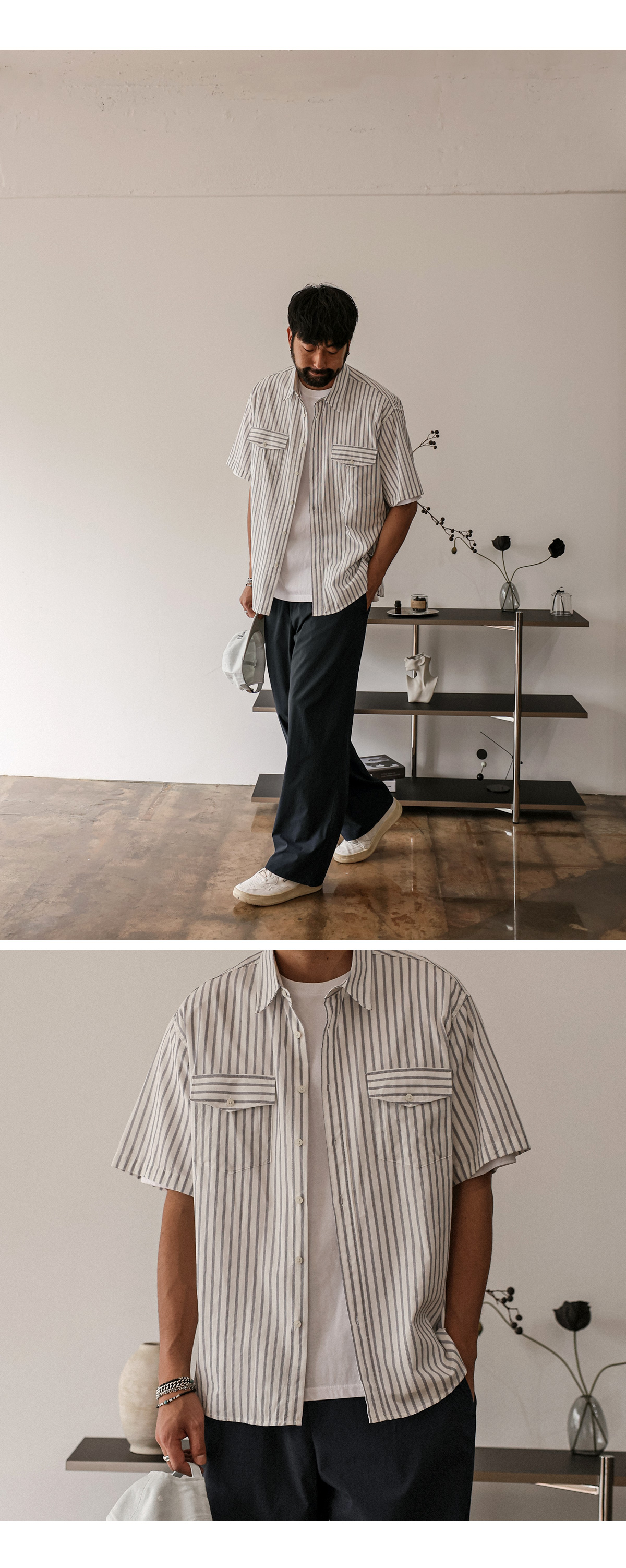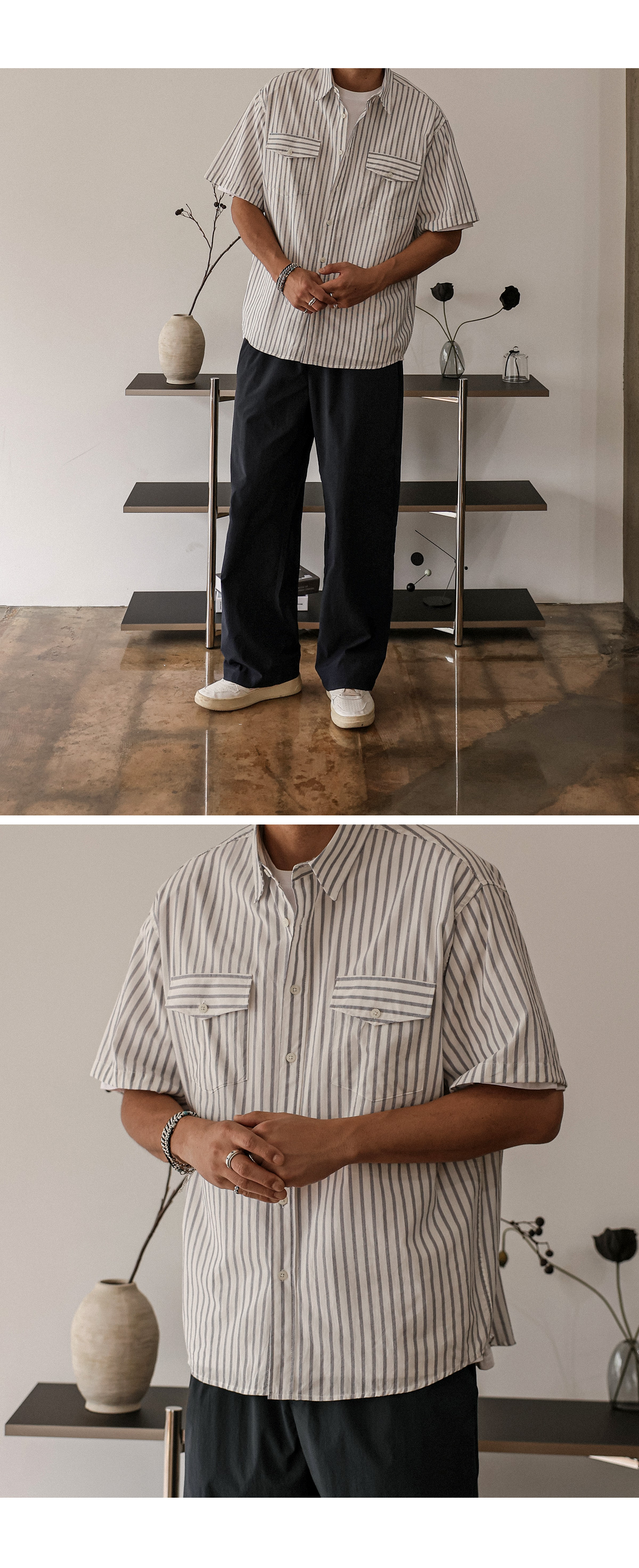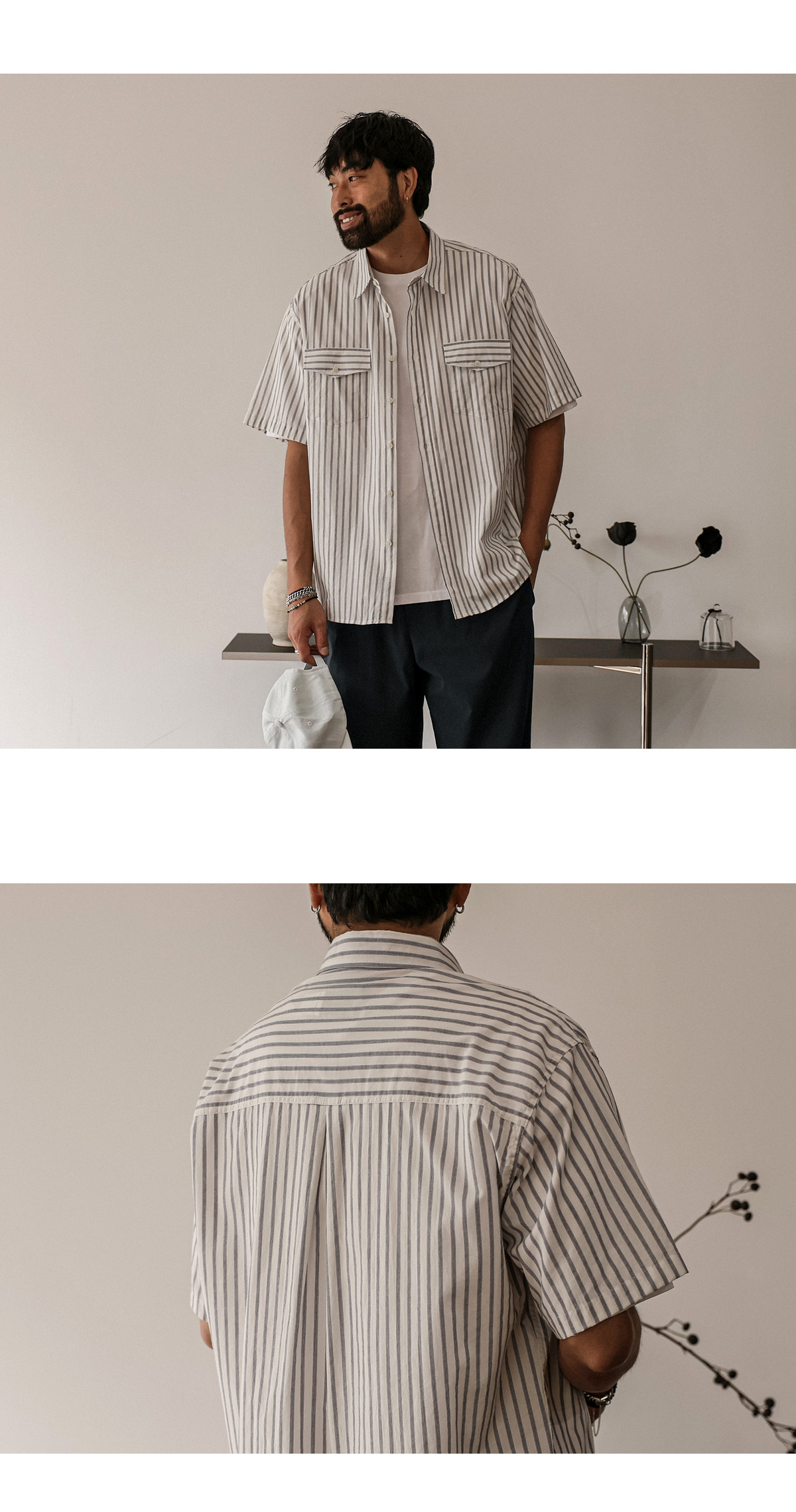 빈티지한 색감의 스트라이프 반팔 셔츠입니다. 여름 내내 착용하기 좋은 두께감은 물론 배색 스트라이프 패턴이 포인트를 주어 버뮤다 팬츠, 면 팬츠, 데님 팬츠 등 팬츠에 따라 스트릿 룩, 캐주얼 룩 등 활용하기 좋으며 핏 또한 루즈핏으로 좀 더 여유 있는 착용감을 느끼실 수 있습니다. SIZE FREE 모델착용 [KIHOON]색상 : 화이트톤 / 사이즈 : FREE ![]() ![]() ![]() ![]() ![]() ![]() ![]() ![]()