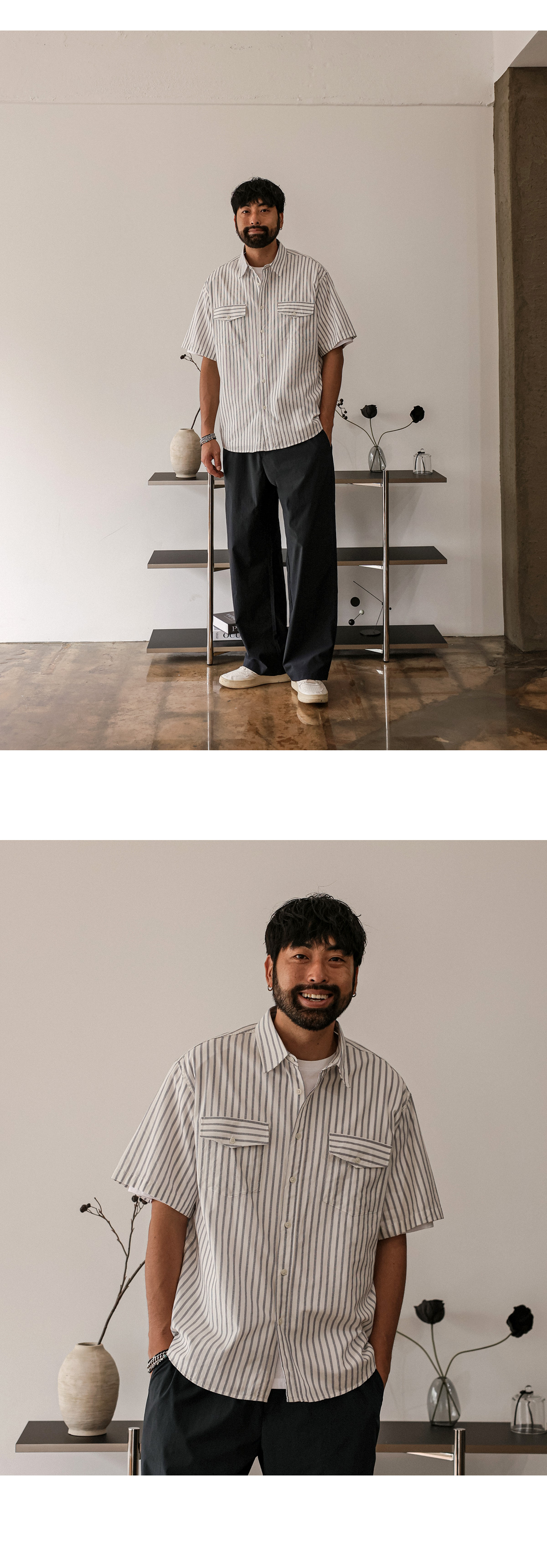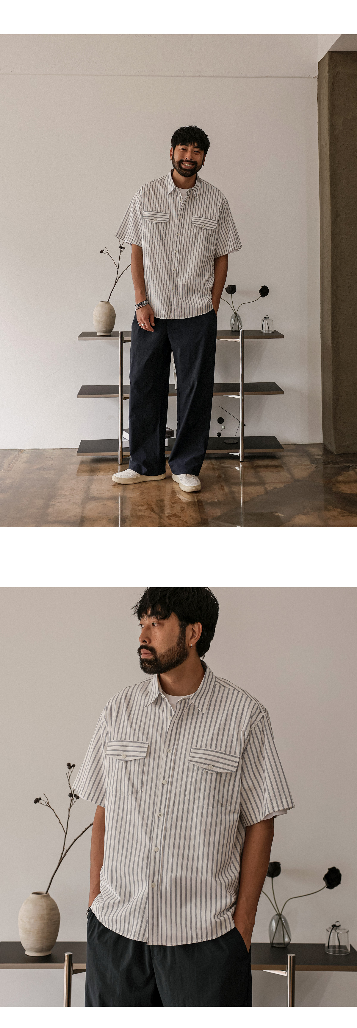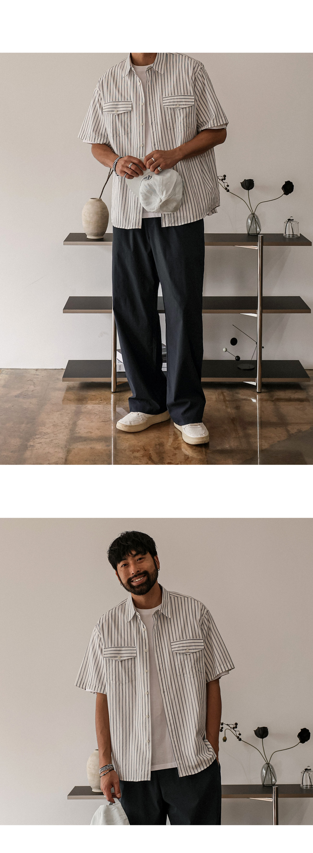 빈티지한 색감의 스트라이프 반팔 셔츠입니다. 여름 내내 착용하기 좋은 두께감은 물론 배색 스트라이프 패턴이 포인트를 주어 버뮤다 팬츠, 면 팬츠, 데님 팬츠 등 팬츠에 따라 스트릿 룩, 캐주얼 룩 등 활용하기 좋으며 핏 또한 루즈핏으로 좀 더 여유 있는 착용감을 느끼실 수 있습니다. SIZE FREE 모델착용 [KIHOON]색상 : 화이트톤 / 사이즈 : FREE ![]() ![]() ![]() ![]() ![]() ![]() ![]() ![]()