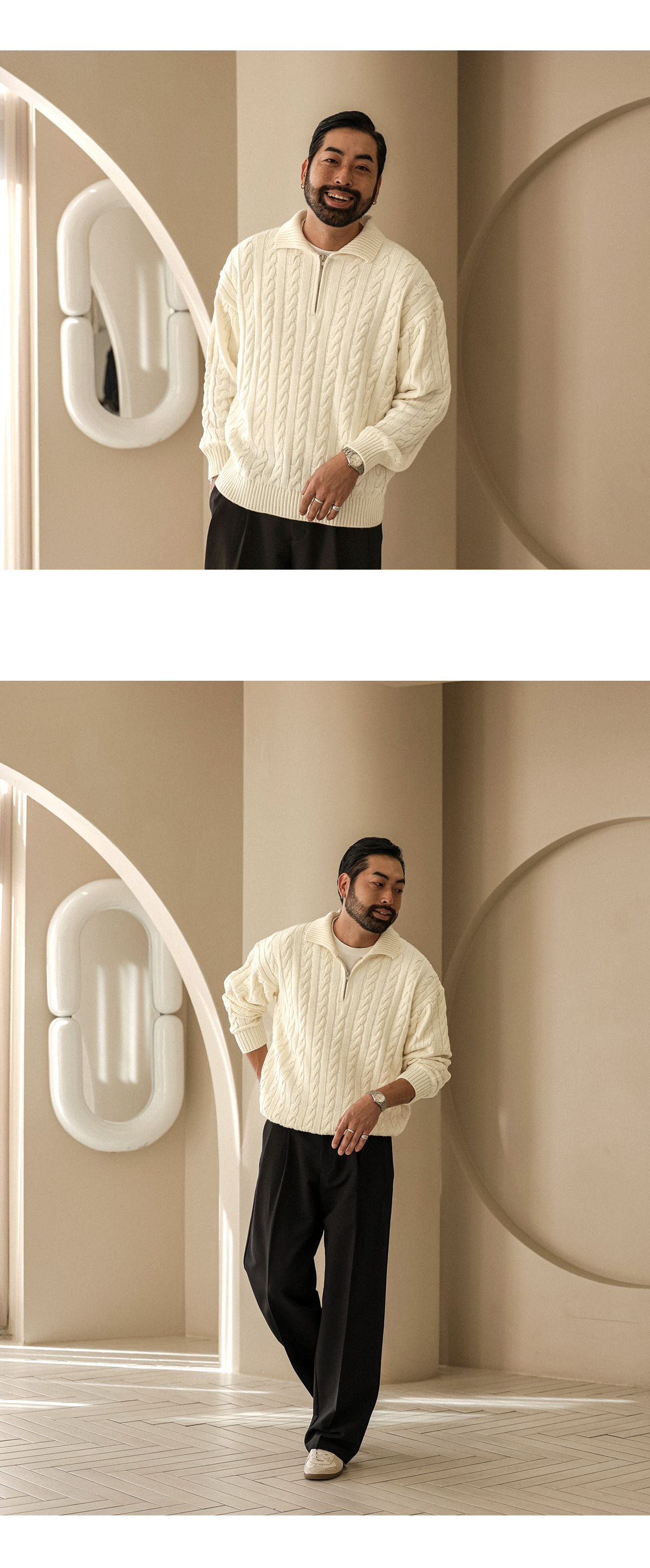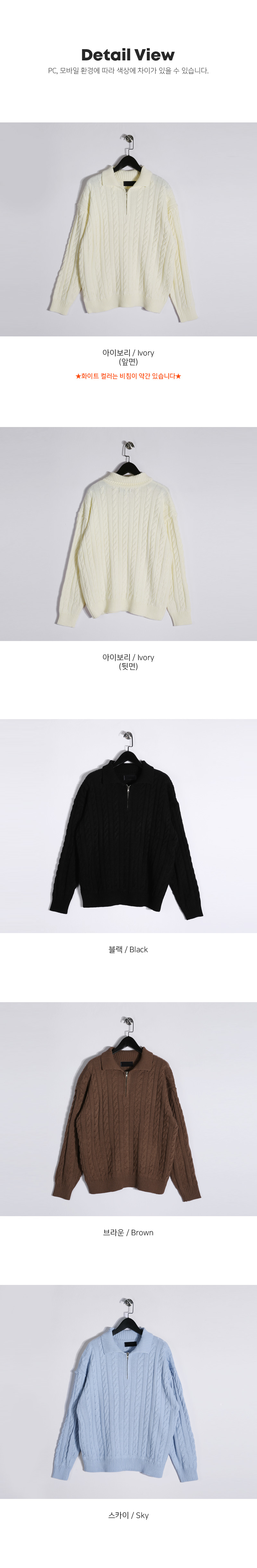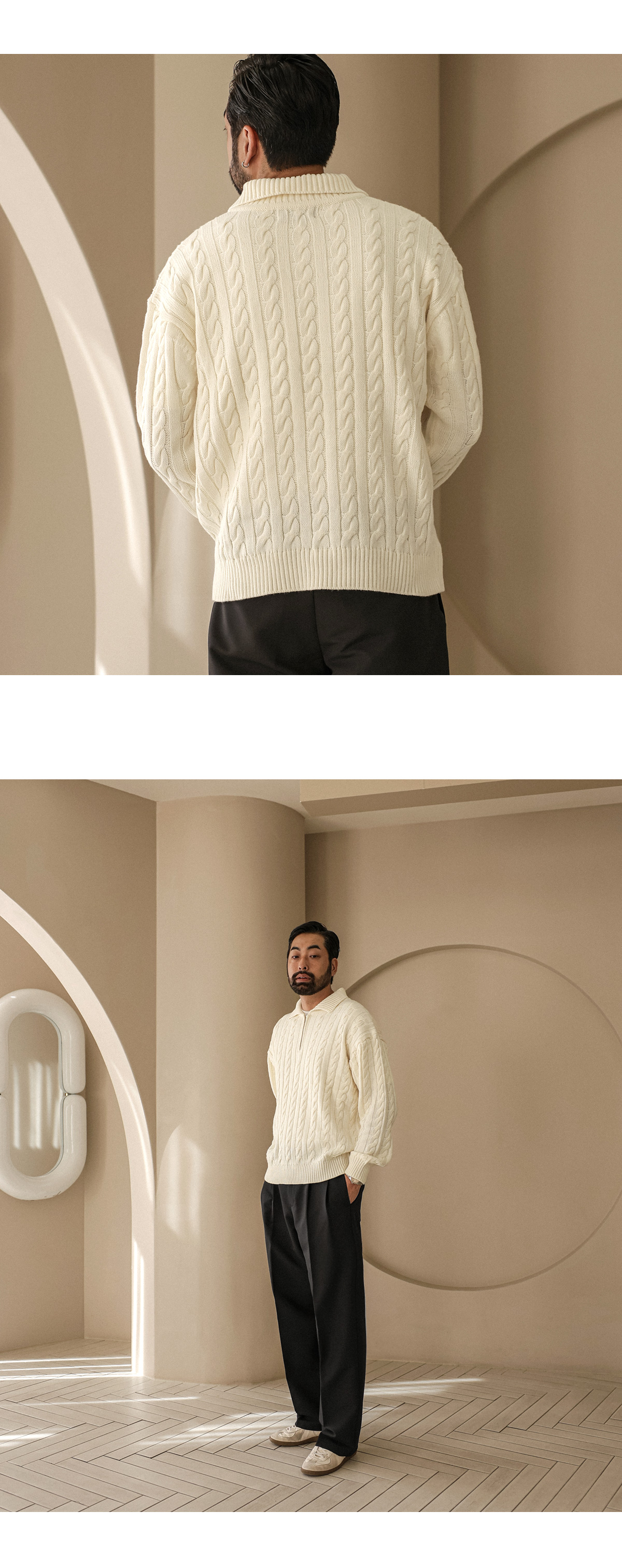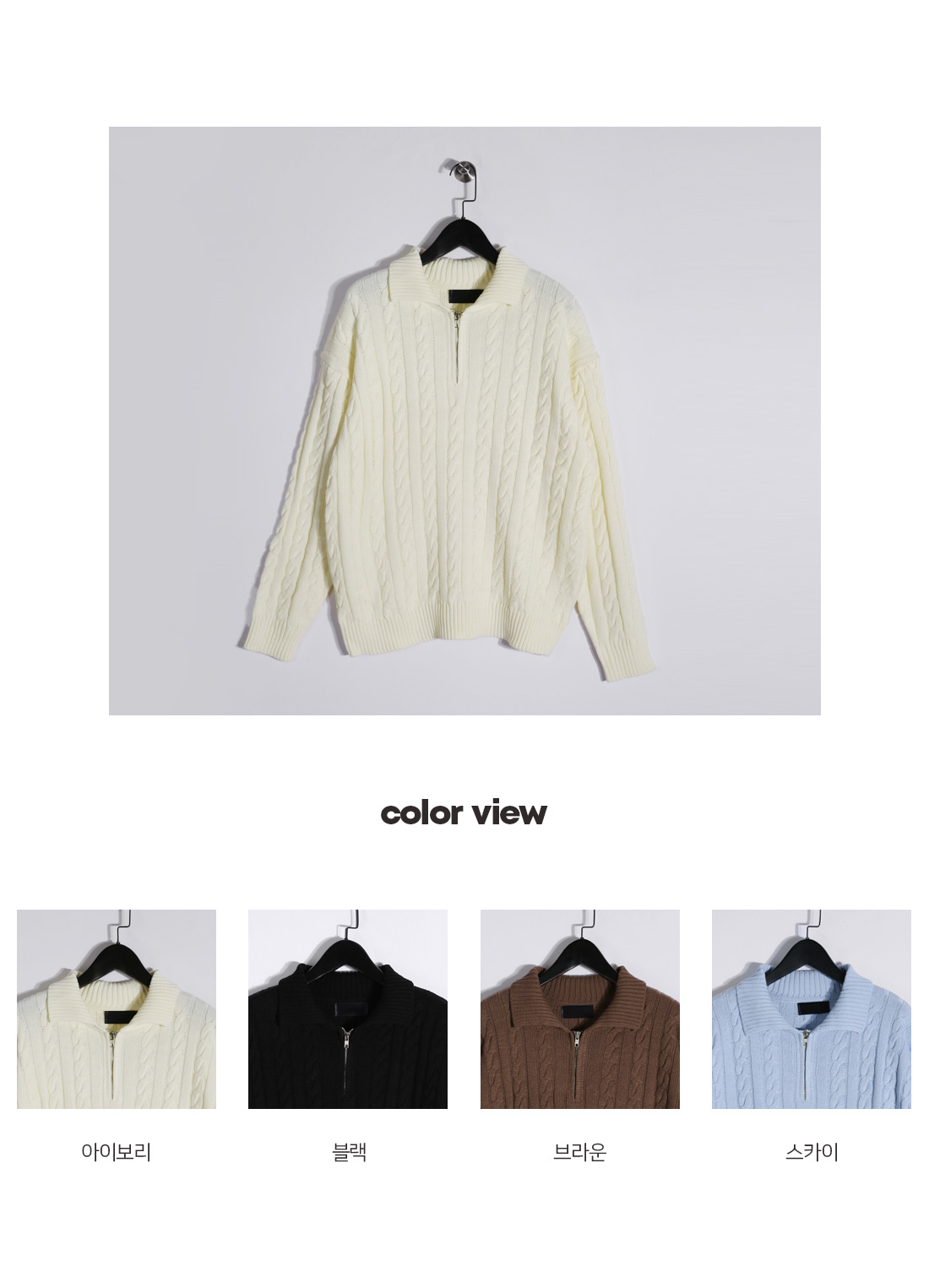클래식한 무드가 돋보이는 하프 집업 케이블 니트입니다.