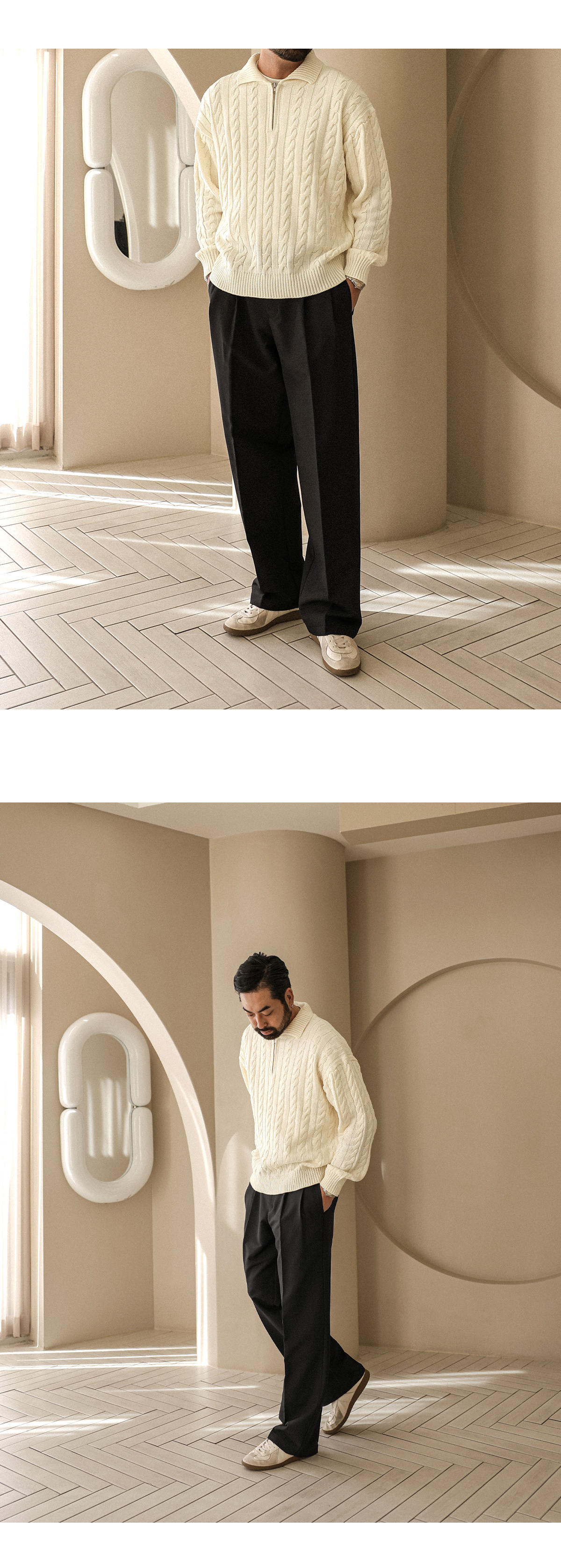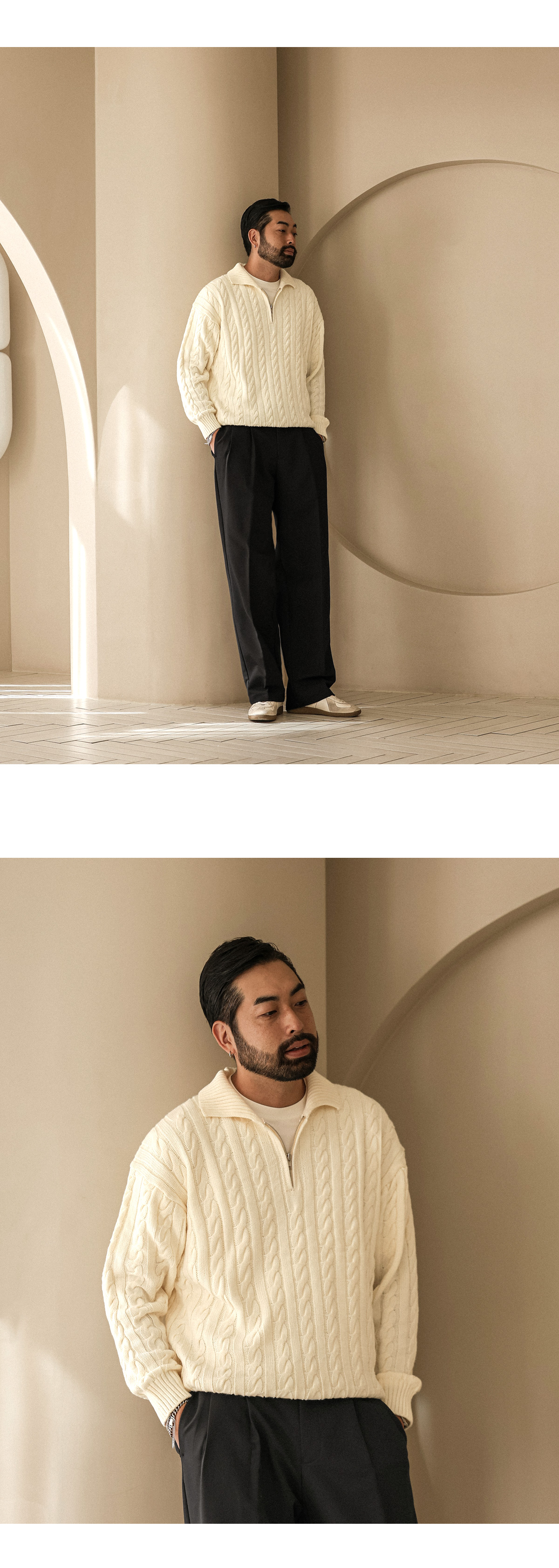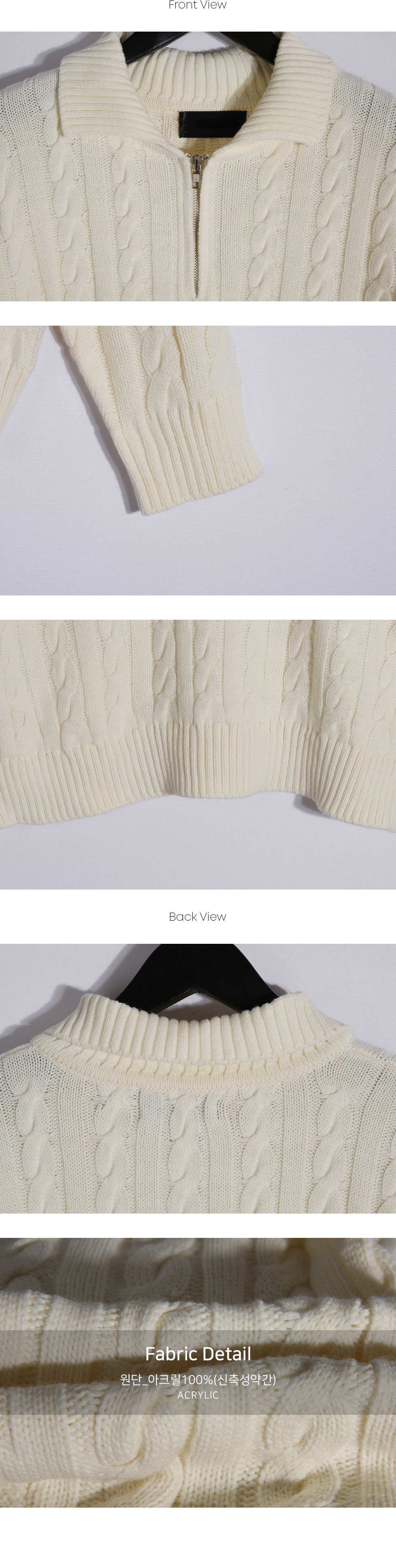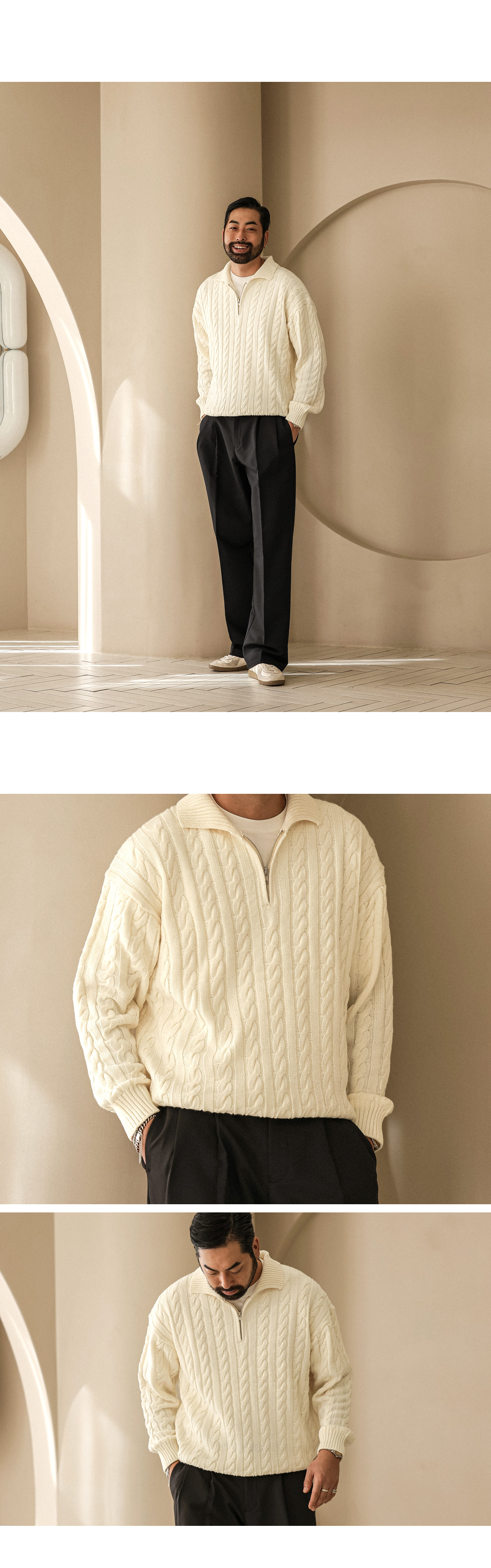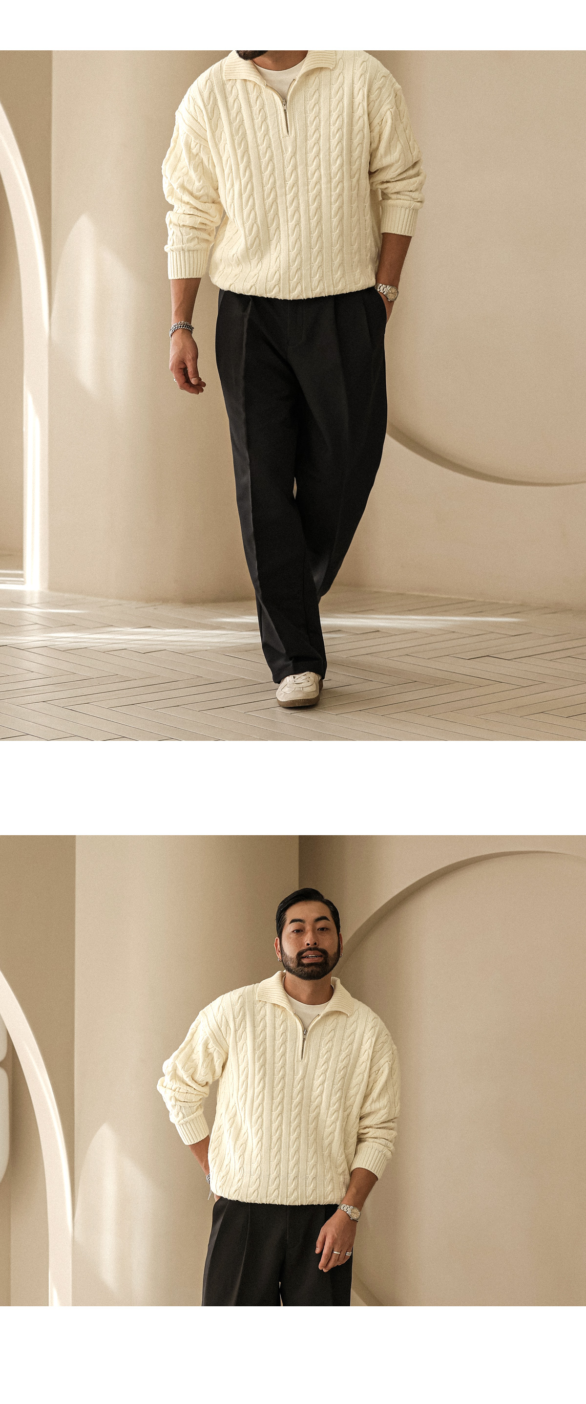 클래식한 무드가 돋보이는 하프 집업 케이블 니트입니다.