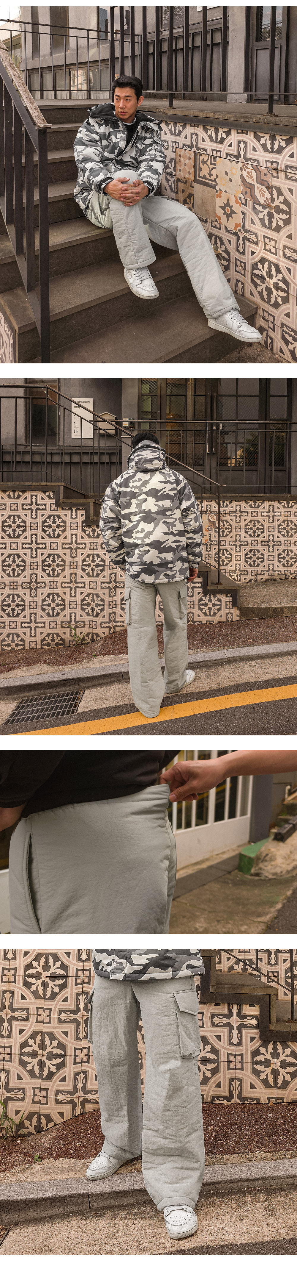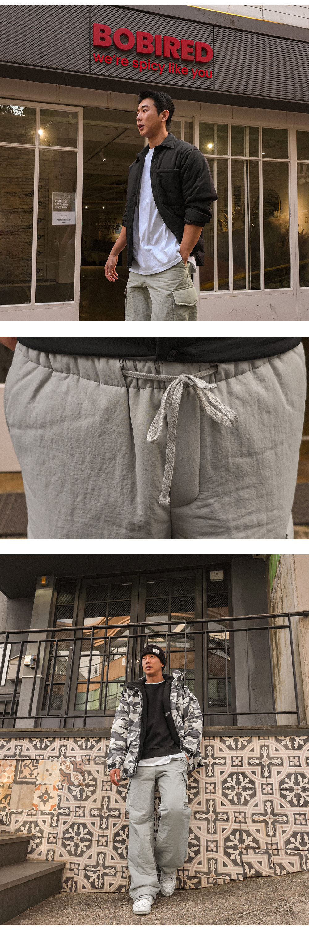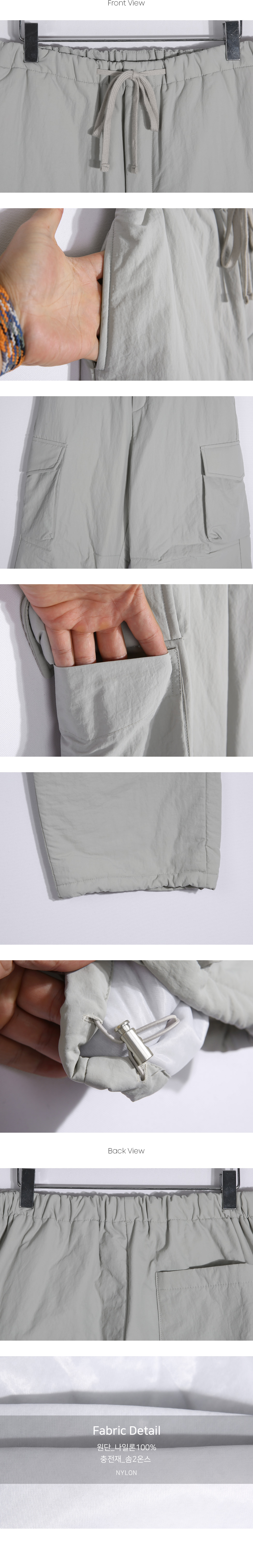 한겨울에도 따뜻함을 지켜주는 패딩 팬츠입니다. 2온스 충전재로 보온성을 유지해주고 가벼우면서도 허리 밴딩으로 장시간 착용에도 편안한 착용감을 느끼실수 있습니다. 밑단 스트링 디테일로 조거 스타일로도 연출이 가능합니다. 또한, 카고 포켓 디테일이 더해져 수납력은 물론 일반 패딩 팬츠와는 다른 트렌디한 디자인으로 스트릿룩, 캐주얼룩 어디에나 손쉽게 매치 가능한 팬츠입니다. SIZE FREE 모델착용 [JUNBEOM]색상 : 그레이 / 사이즈 : FREE