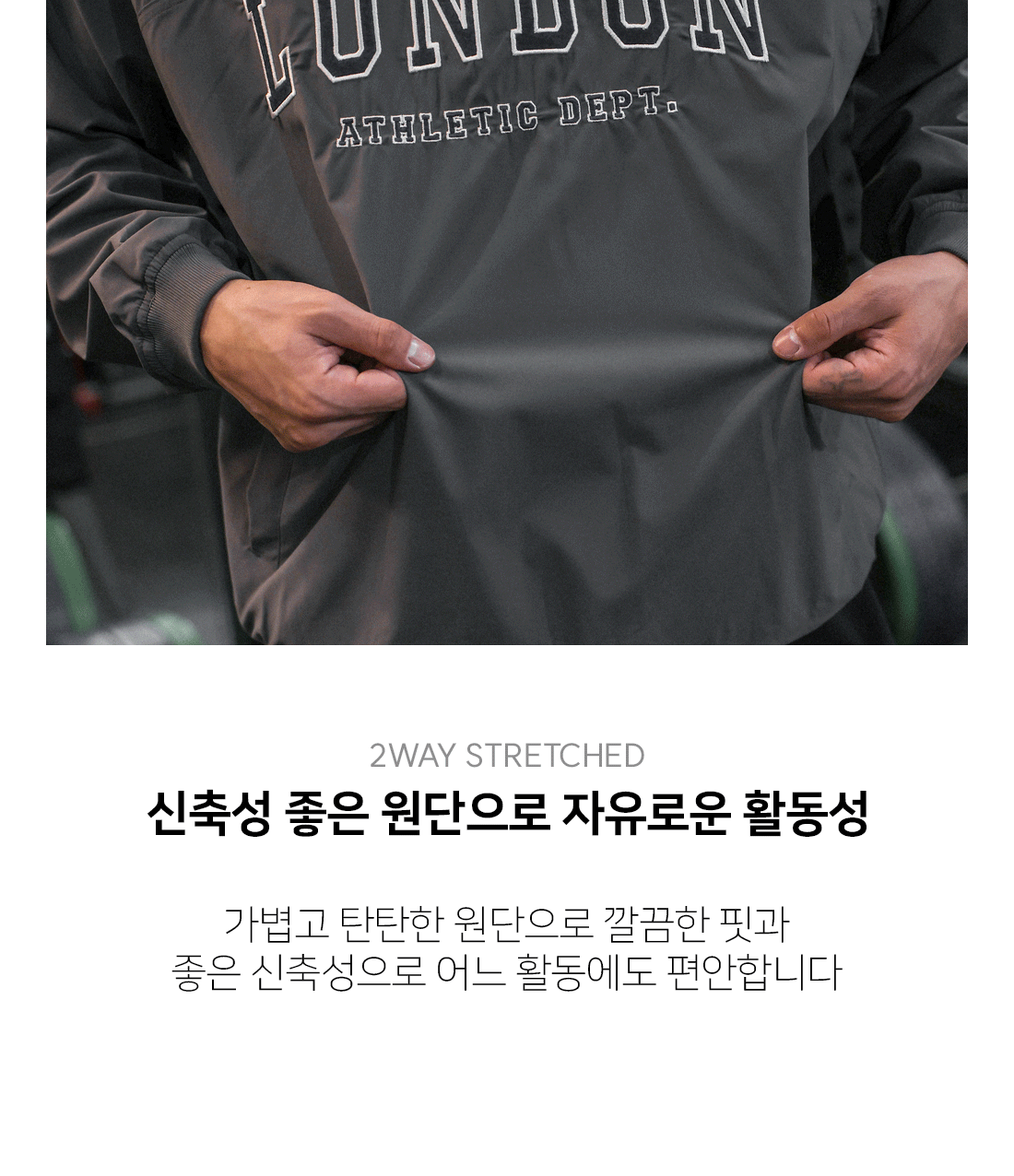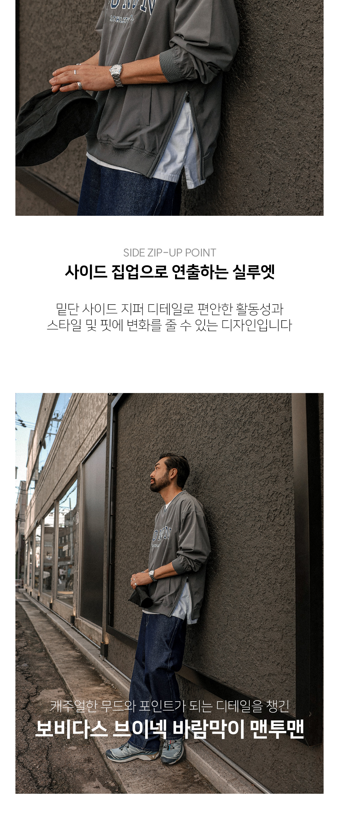 오까네 자체 제작으로 완성된 브이넥 바람막이 맨투맨입니다. 가볍고 탄탄한 원단을 사용해 깔끔한 실루엣과 뛰어난 착용감을 자랑하며 간절기부터 초겨울까지 활용하기 좋은 아이템입니다. 전면의 레터링으로 캐주얼한 무드를 살렸고 밑단과 소매에 밴딩 처리를 더해 편안하면서도 안정감있게 떨어지는 핏을 완성했습니다. 사이드 지퍼 디테일을 더해 스타일 및 핏에 변화를 줄 수 있어 실용성까지 챙긴 디자인입니다. 단품으로도 포인트가 되고 데님이나 조거 팬츠와 매치해 다양한 분위기로 연출할 수 있어 활용도가 높습니다. 오까네만의 감성을 담은 베이직하면서도 세련된 실루엣의 자체 제작 제품입니다. SIZE XL-2XL,3XL-4XL,5XL-6XL 모델착용 [KIHOON]색상 : 그레이 / 사이즈 : XL-2XL [JUNBEOM]색상 : 카키 / 사이즈 : XL-2XL ![]() ![]()