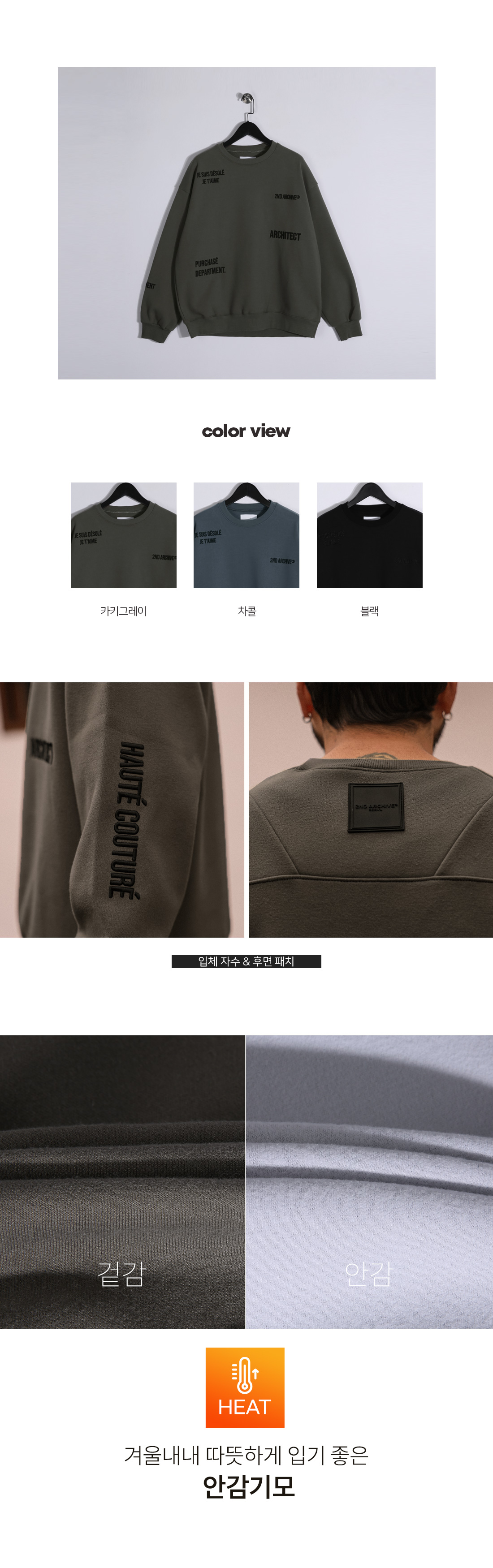 트렌디하면서도 힙한 분위기를 완성해주는 기모 맨투맨입니다. 터치감이 좋은 코튼,폴리 혼방 소재로 피부에 자극 없이 깔끔하게 착용되며 한겨울에도 거뜬하게 입을 수 있도록 안감기모를 추가하여 촉감부터 착용감까지 부드럽게 다가옵니다. 여유있는 품에 드롭 숄더 라인으로 설계되어 움직임이 많은 날에도 높은 활동성을 자랑하고, 단정한 라운드 넥과 시보리 마감이 군더더기 없는 실루엣을 연출해줍니다. 전체적으로 부분 부분 들어간 입체적인 자수와 후면 패치 디테일로 어느 룩에 매치해도 트렌디하면서 감각적인 실루엣을 구현했습니다. SIZE FREE 모델착용 [KIHOON]색상 : 카키그레이 / 사이즈 : FREE ![]() ![]() ![]() ![]() ![]() ![]() ![]() ![]() ![]()