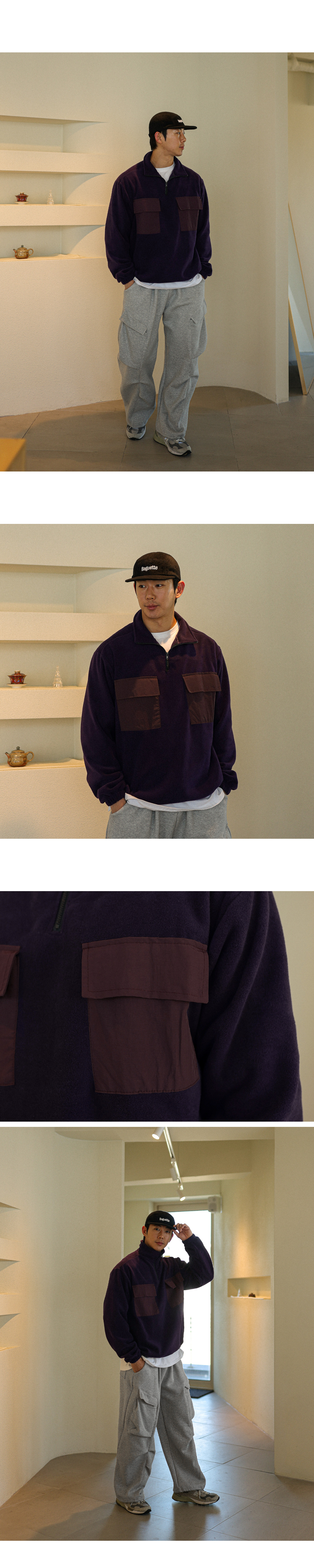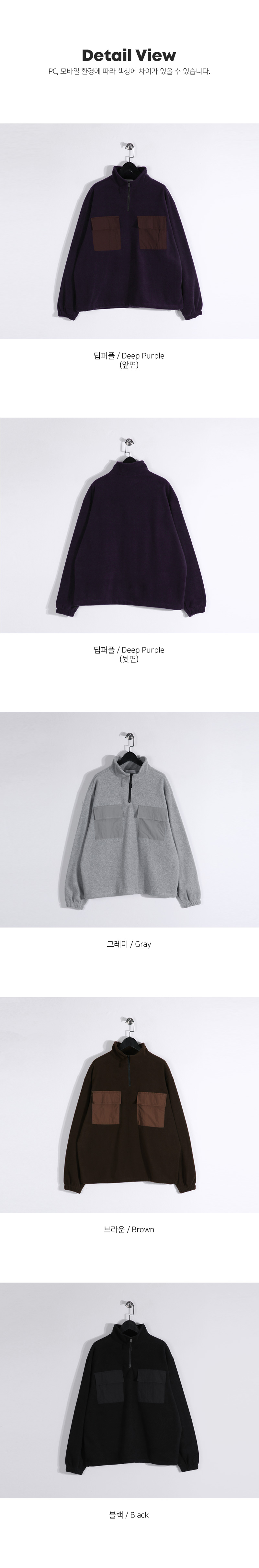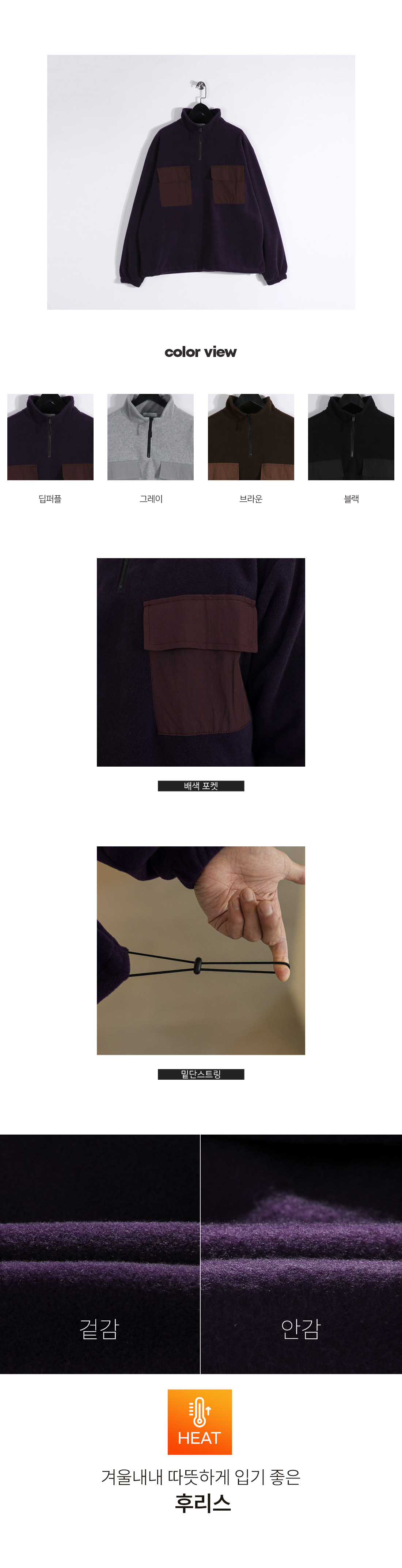 담요처럼 포근한 후리스 아노락입니다. 후리스 특유의 뽀송한 텍스처가 살아있으면서도 몸에 부드럽게 감기는 유연한 소재감과 프론트 부분 은은한 배색 포켓으로 포인트를 더해 완성도 높은 실루엣을 연출해줍니다. 보온성은 충분히 챙기되 부담스럽지 않게 두텁지 않은 두께로 부해 보이지 않는 핏으로 단독으로도, 외투 안 이너로도 멋스럽게 스타일링 됩니다. 자연스럽게 올라오는 반하이넥 디자인으로 답답하지 않게 목을 감싸주며, 밑단에는 짱짱한 스트링을 추가해 입체감 있는 아웃핏을 유지해줍니다. 과하지 않은 디테일들로 다양한 룩에 웨어러블하게 활용해보시길 바랍니다. SIZE FREE 모델착용 [JUNBEOM]색상 : 딥퍼플 / 사이즈 : FREE ![]() ![]() ![]() ![]() ![]() ![]() ![]() ![]() ![]()
