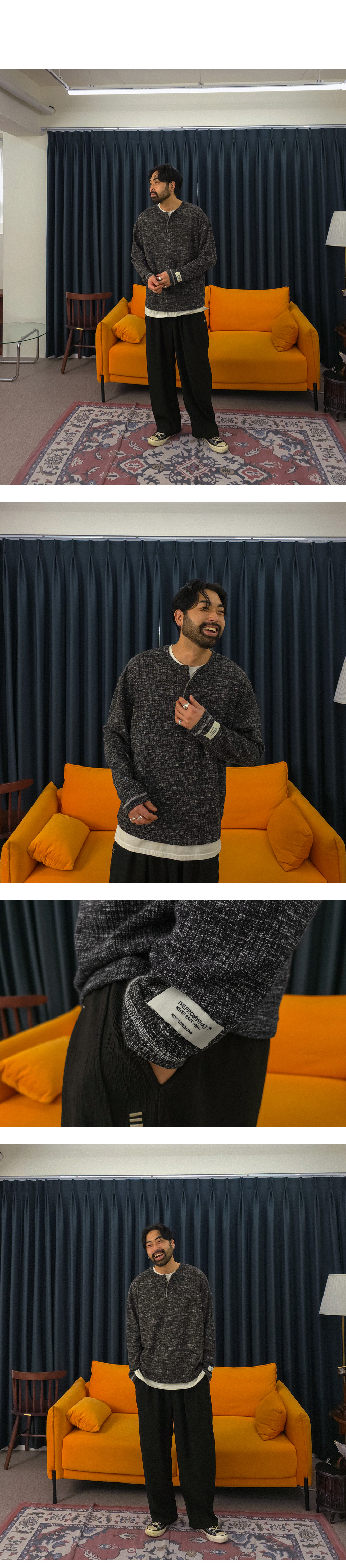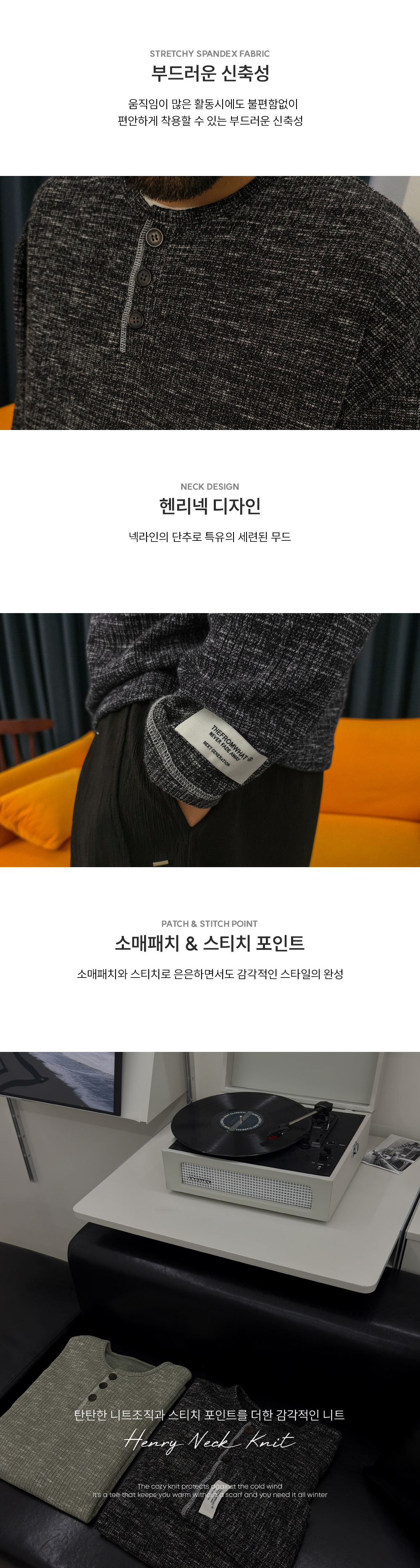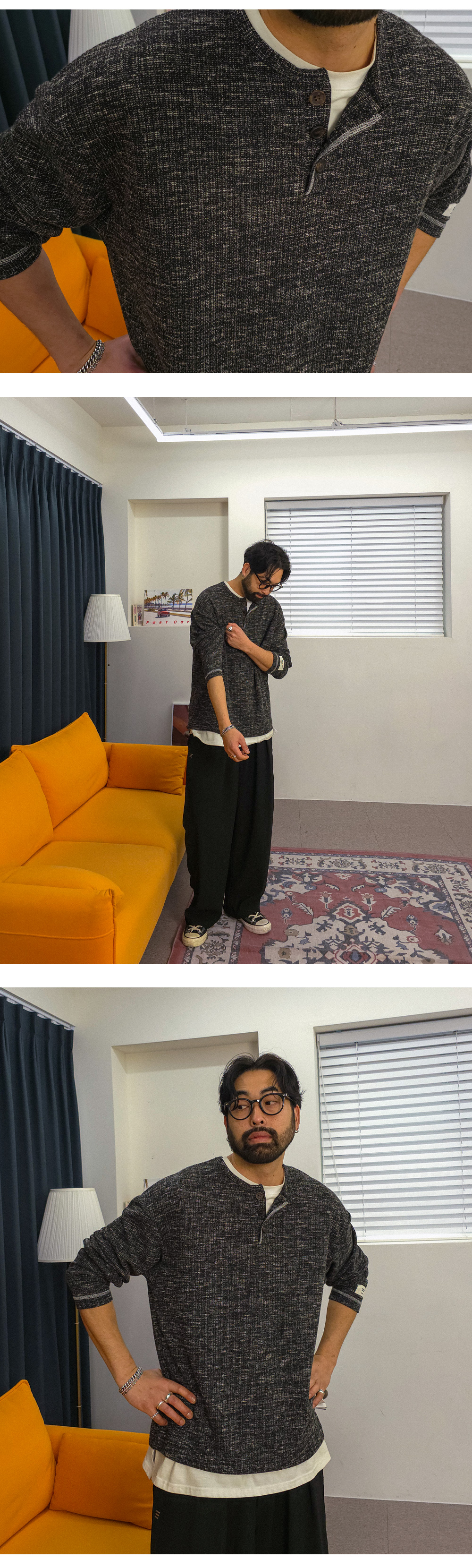 팬츠에 따라 전혀 다른 분위기를 연출하는 헨리넥 긴팔 니트입니다. 부드러우면서도 탄탄한 니트 조직으로 제작되어 편안한 활동성과 안정적인 핏을 동시에 만족시켜 주며, 형태 변형이 적어 오랫동안 완성도 높은 실루엣을 유지할 수 있습니다 . 적당한 두께감으로 간절기는 물론 초여름까지도 부담 없이 활용 가능해 높은 실용성을 자랑합니다. 헨리넥 디자인 특유의 세련된 무드에 소매 패치 디테일과 스티치 포인트를 더해 은은하면서도 감각적인 포인트를 완성했습니다. 면팬츠, 데님팬츠, 슬랙스 등 다양한 팬츠와 자연스럽게 어우러져 캐주얼부터 세미 포멀까지 폭넓은 스타일링의 완성도를 높여줄 니트 입니다. SIZE L-XL,2XL-3XL,4XL-5XL,6XL-7XL 모델착용 [KIHOON]색상 : 블랙 / 사이즈 : L-XL ![]() ![]() ![]() ![]() ![]() ![]() ![]() ![]()