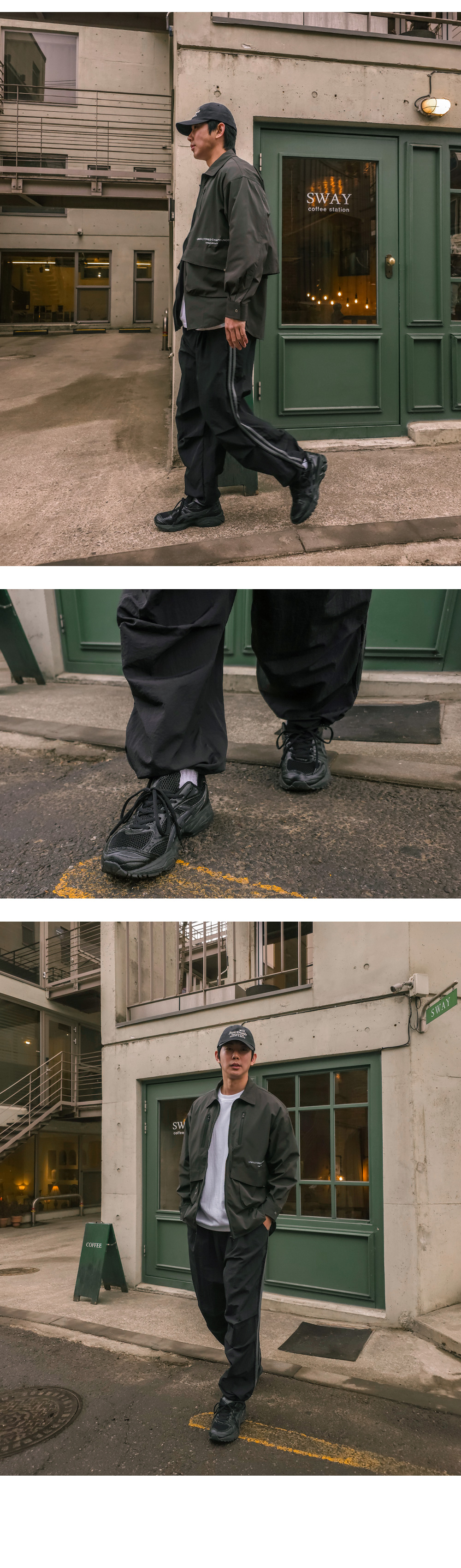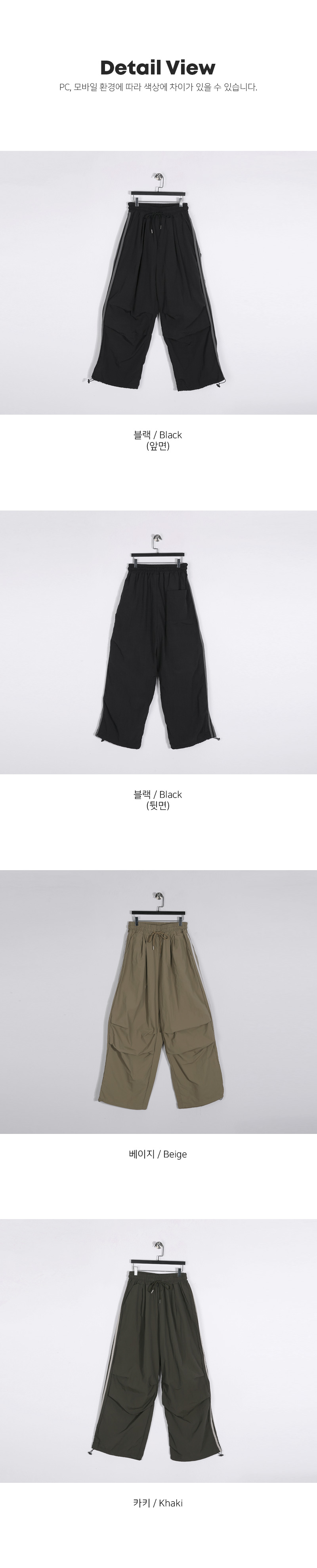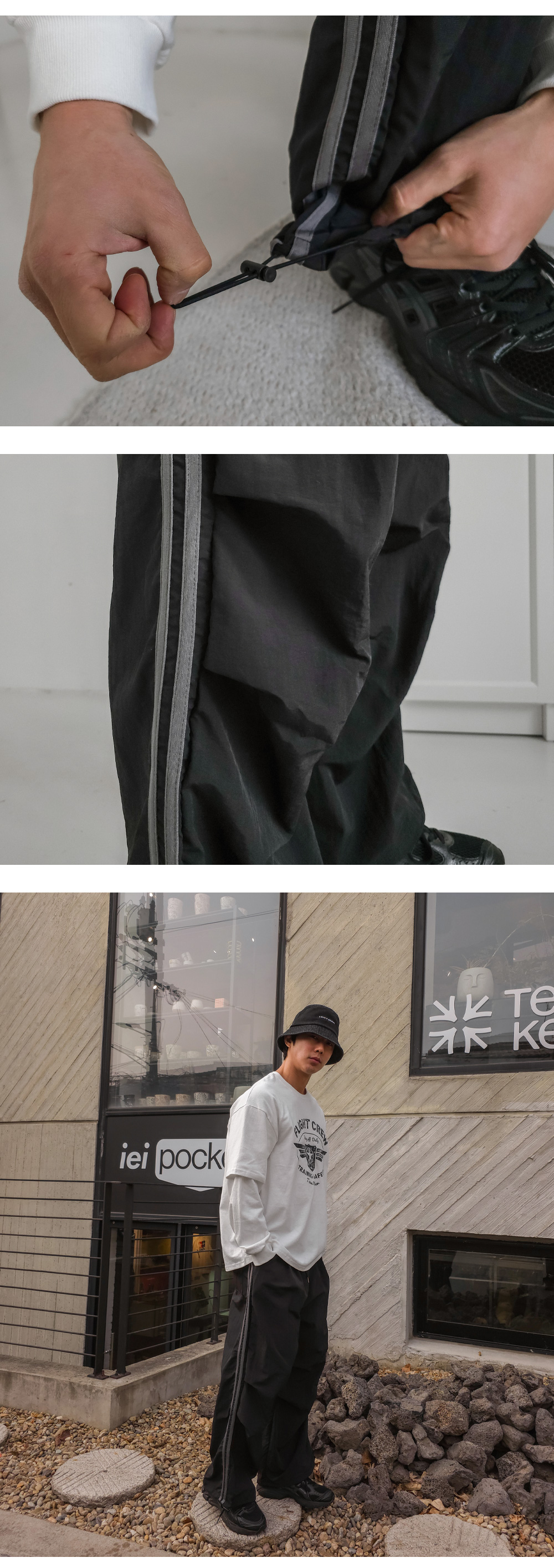 가볍게 스타일링하기 좋은 트랙 팬츠입니다. 나일론 100% 소재로 제작되어 한 겨울을 제외한 모든 계절에 코디 하기 좋은 아이템이며, 양 사이드 배색 라인과 파라슈트 턱을 추가하여 트렌디하면서 힙한 무드를 선사합니다. 허리 라인 전체 밴딩 처리에 끈을 더해 내 사이즈에 맞게 조절해 입으실 수 있답니다. 실사용 가능한 양 사이드 리얼 포켓과 취향에 맞는 무드로 연출 가능한 밑단 스트링까지 팬츠 하나만으로도 룩의 완성도를 높여주는 팬츠입니다. SIZE FREE 모델착용 [JUNBEOM]색상 : 블랙 / 사이즈 : FREE