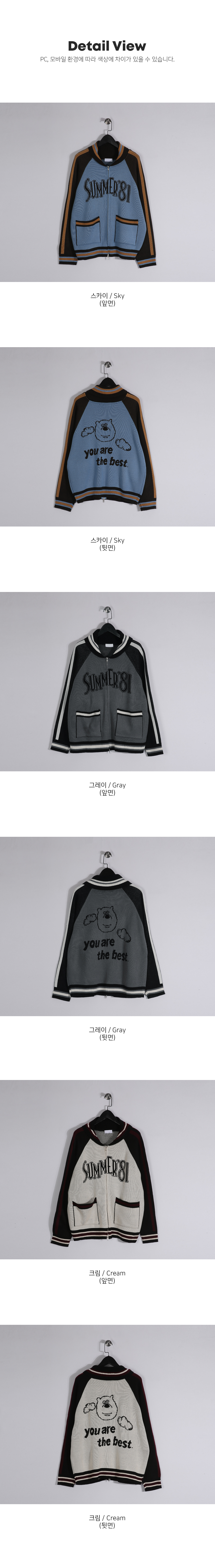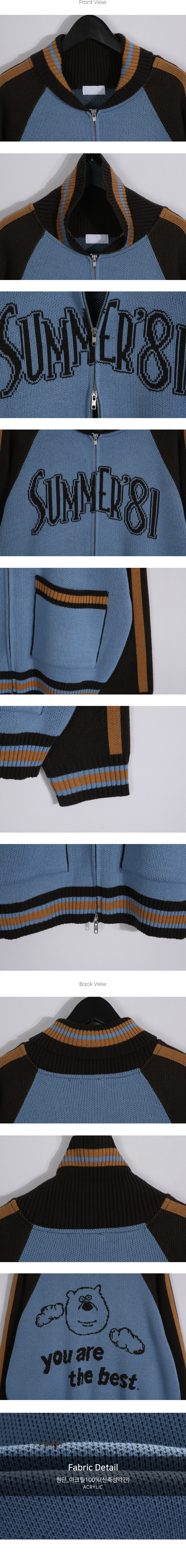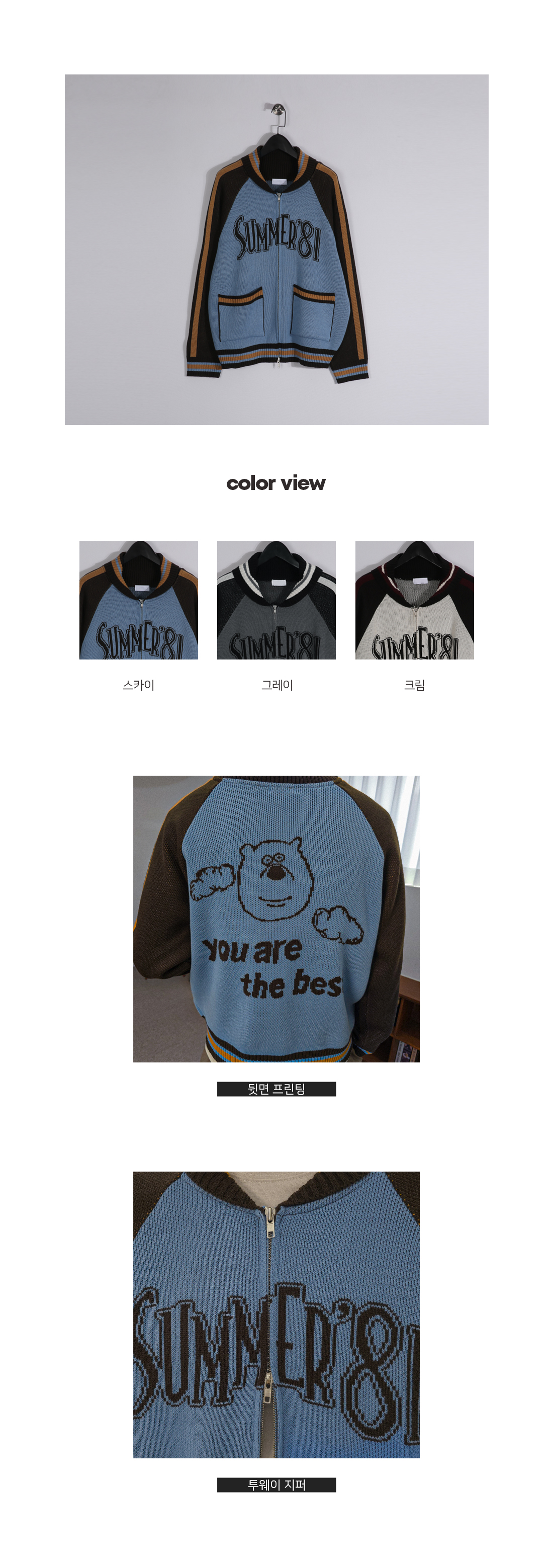 배색과 레터링 디테일로 포인트를 준 니트 집업입니다.