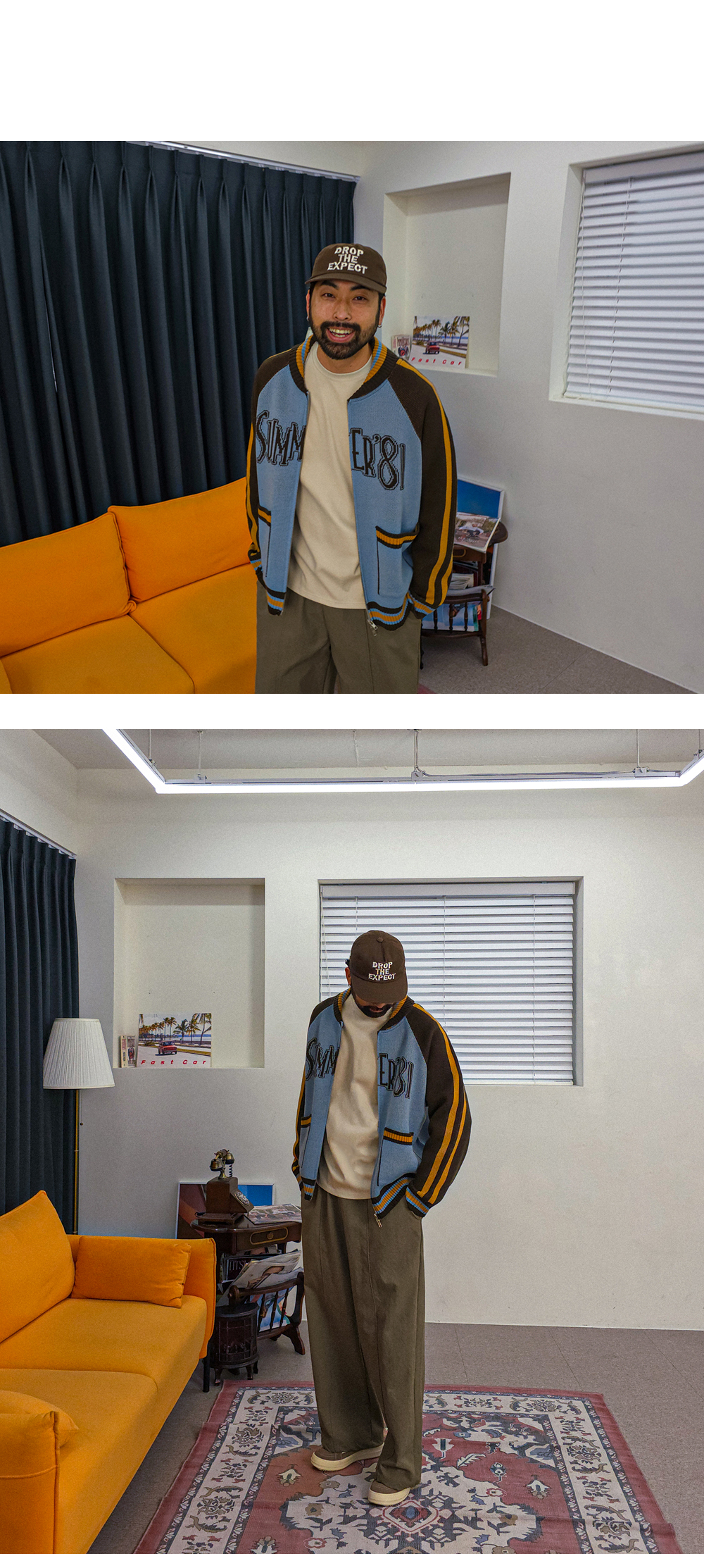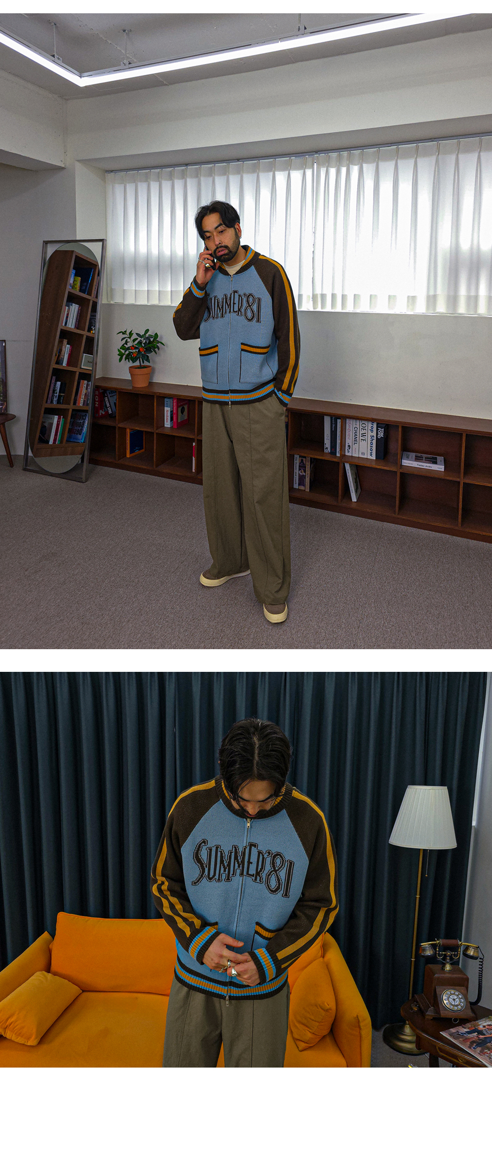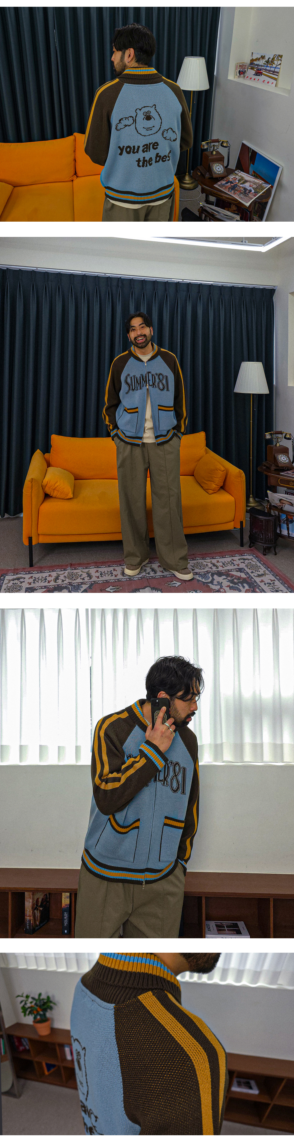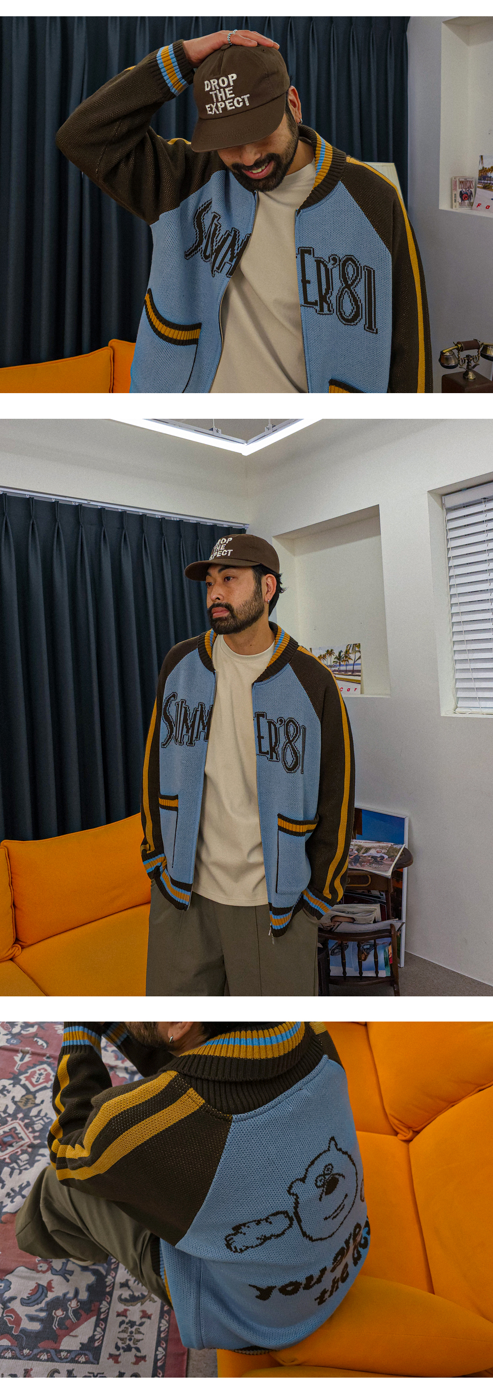배색과 레터링 디테일로 포인트를 준 니트 집업입니다.