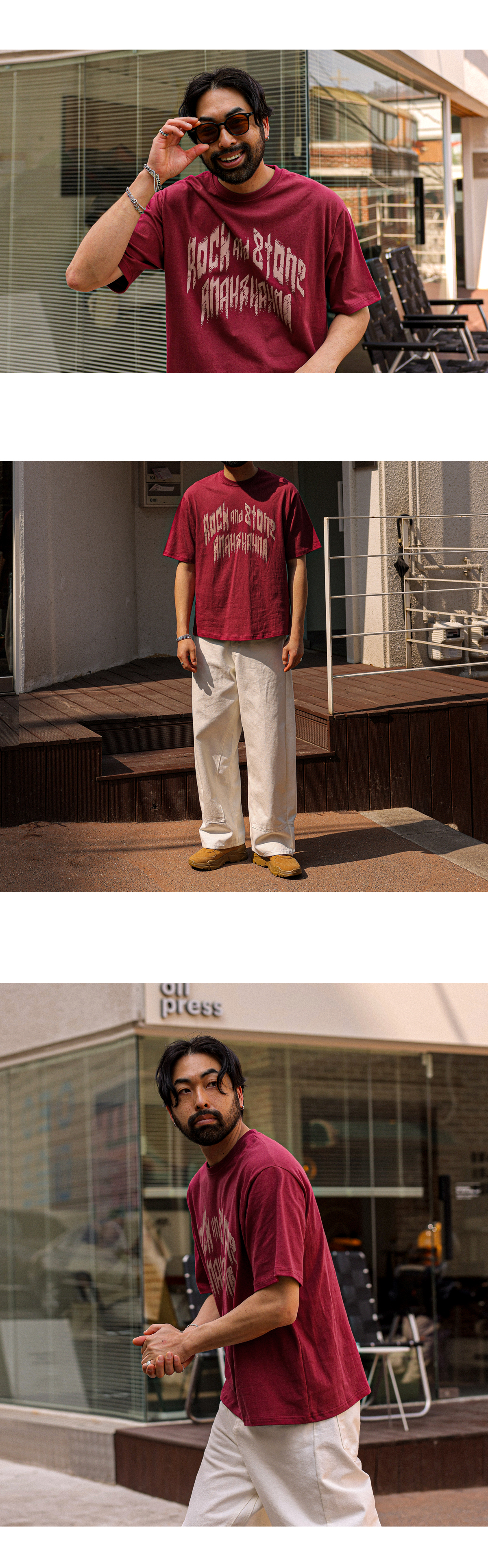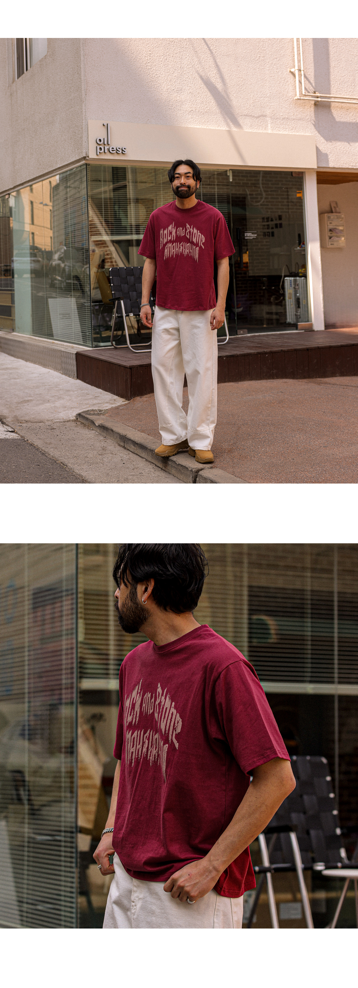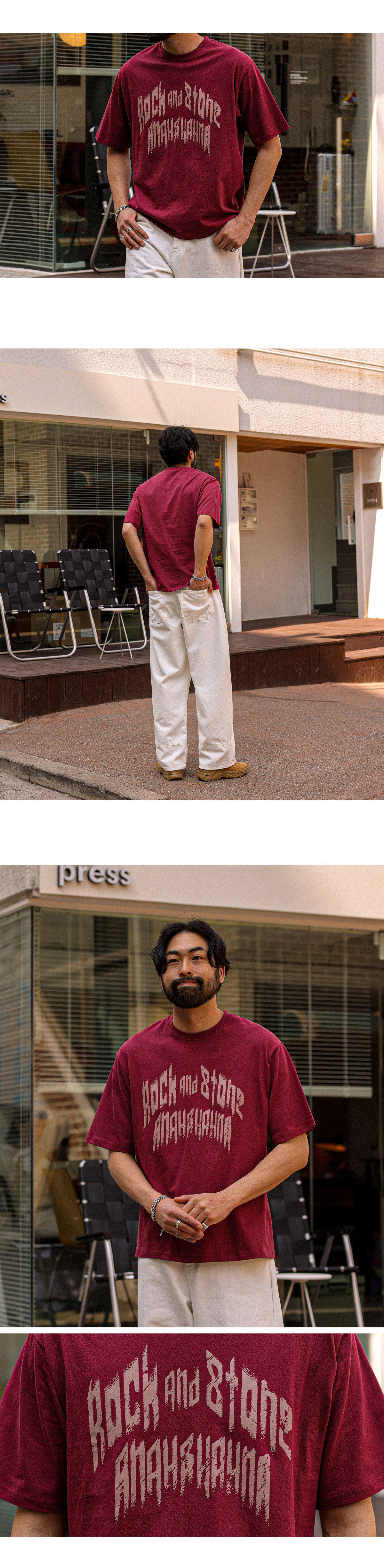빈티지한 무드의 레터링이 돋보이는 반팔 티셔츠입니다. 배색 레터링 디테일로 감각적인 포인트를 더했으며 면 팬츠,데님 팬츠 등 다양한 아이템과 자연스럽게 어우러집니다. 데일리룩은 물론, 커플룩으로도 활용하기 좋은 아이템으로 스타일리시한 연출이 가능한 아이템 입니다. COLOR 버건디,블랙,백오트,브라운,아이보리 SIZE FREE 모델착용 [KIHOON]색상 : 버건디 / 사이즈 : FREE ![]() ![]() ![]() ![]() ![]() ![]() ![]() ![]()