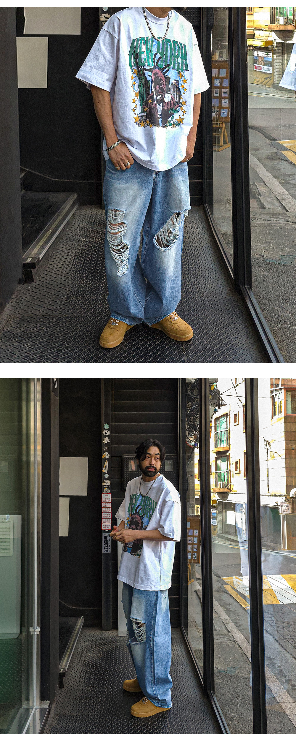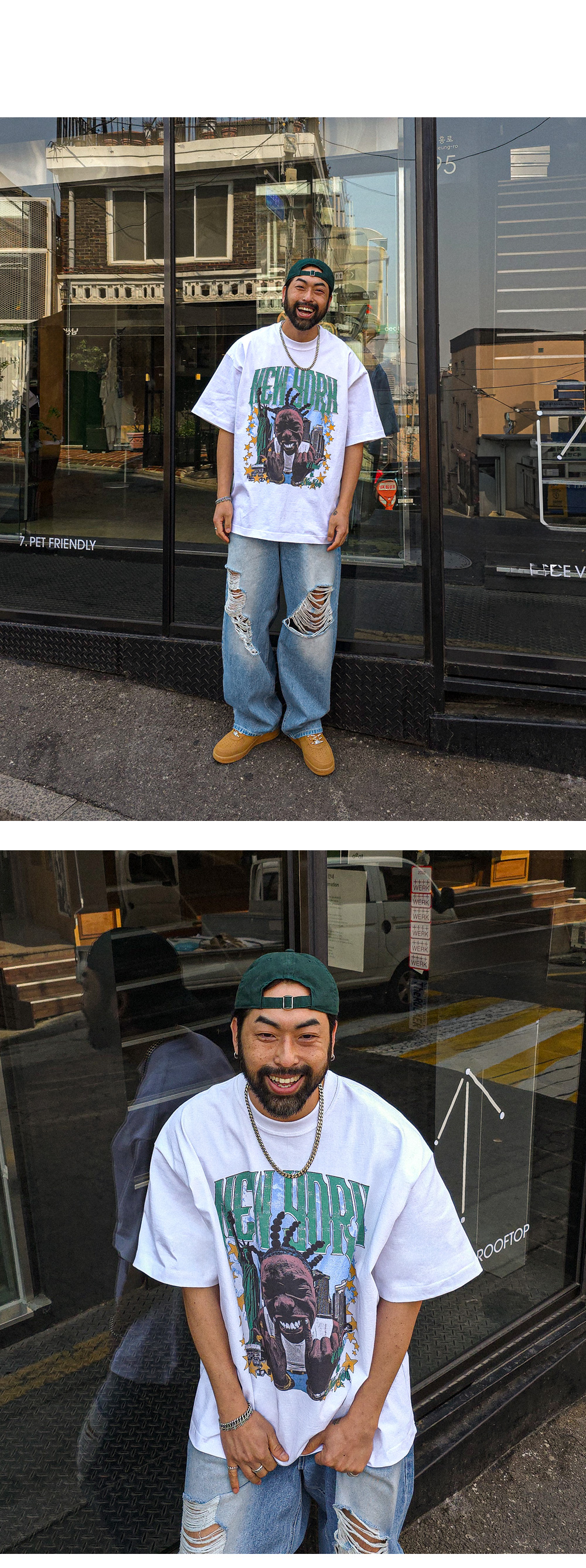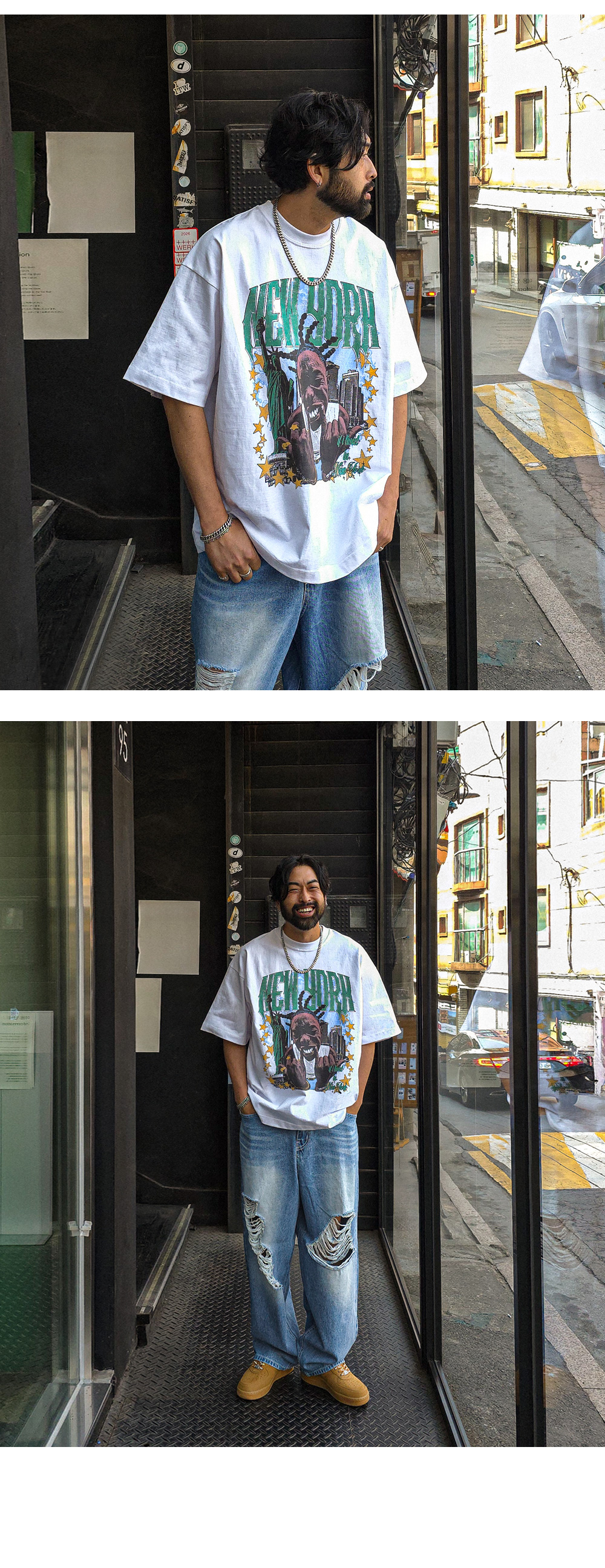 힙한 느낌을 주는 반팔 티셔츠입니다. 유니크한 느낌을 주는 나염으로 포인트를 주었습니다. 사이즈 또한 넉넉한 오버핏으로 제작되었으며 탄탄한 원단감으로 오래도록 입을 수 있어 여름에는 단품으로 봄, 가을에는 점퍼 안에 코디하기에도 좋은 반팔 티셔츠입니다. COLOR 화이트,그레이,브라운,블랙 SIZE XL-2XL(1번),3XL-4XL(2번) 모델착용 [KIHOON]색상 : 화이트 / 사이즈 : 3XL-4XL(2번) ![]() ![]() ![]() ![]() ![]() ![]() ![]() ![]()